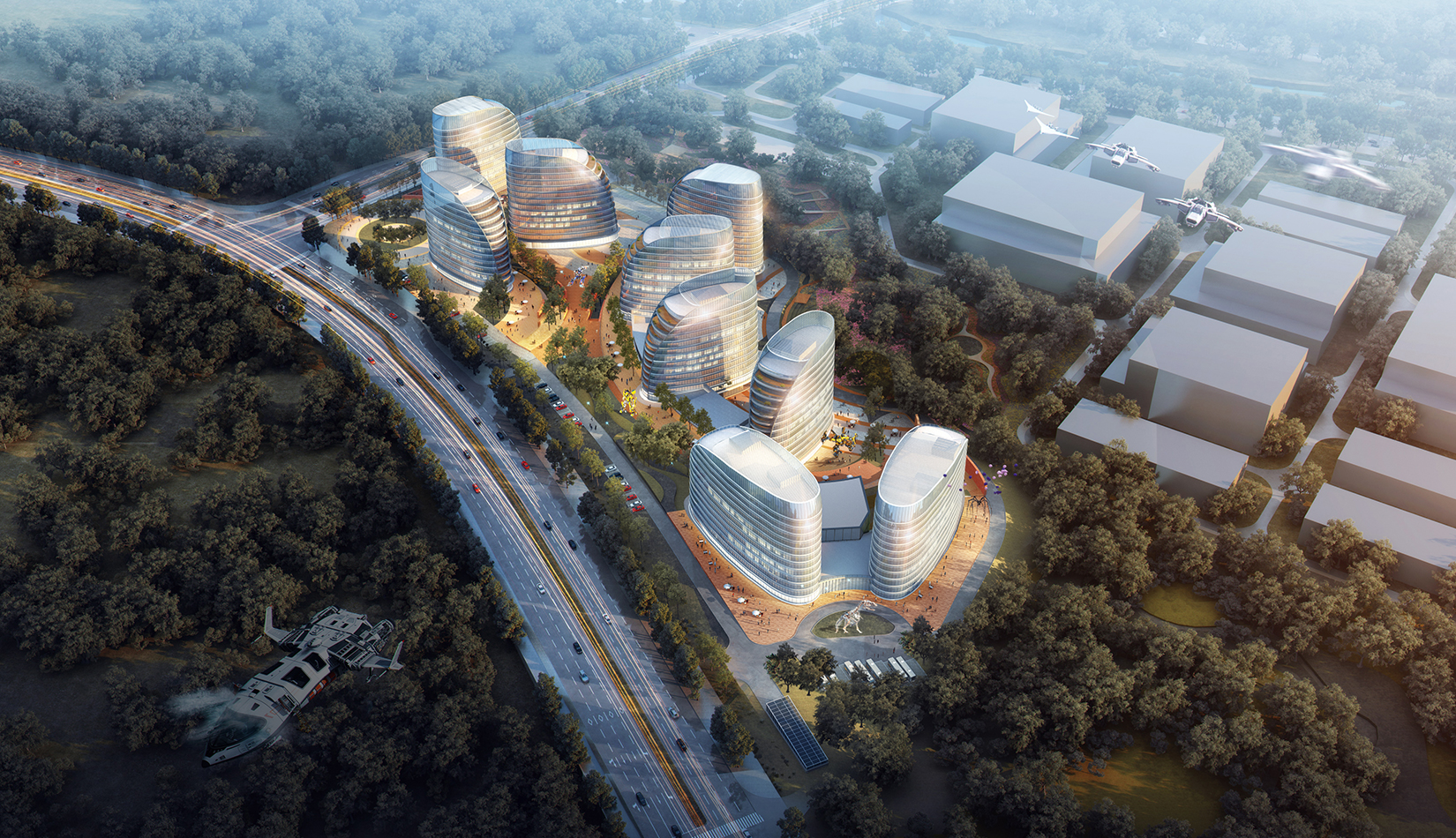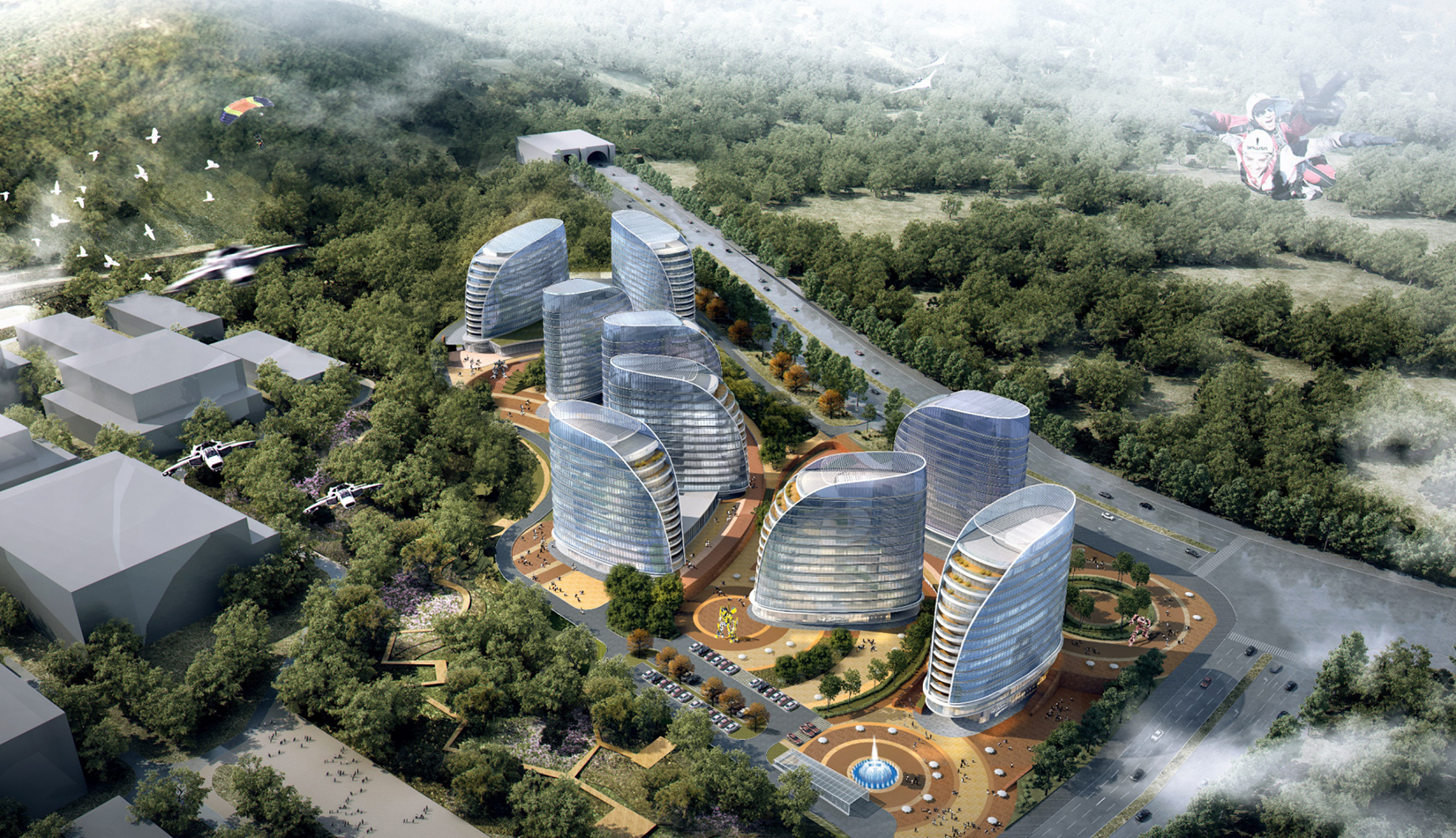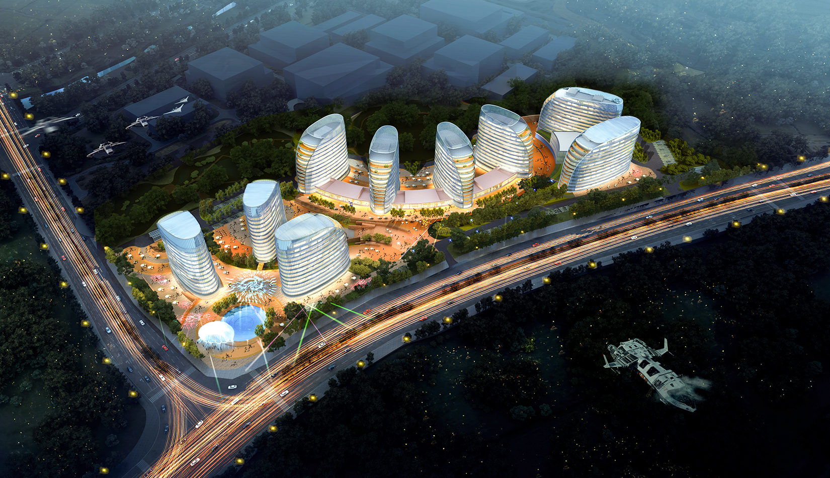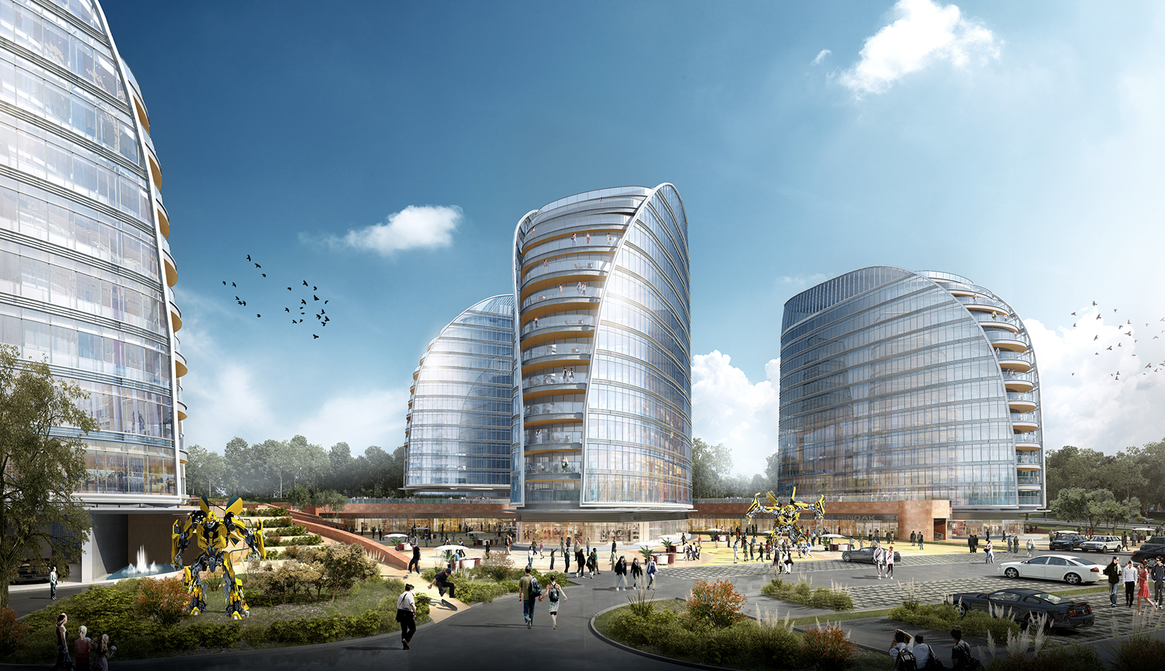 注重地塊內(nèi)空間環(huán)境的滲透和景觀視線效果,保持地塊環(huán)境與城市環(huán)境的共融性,提升城市空間價(jià)值。建筑外觀采用簡(jiǎn)潔、現(xiàn)代的風(fēng)格,立面形象富有視覺(jué)沖擊力,樹(shù)立企業(yè)品牌與形象。高層建筑層層平臺(tái)向景觀蔓延,為人們提供豐富多變的生活工作空間。底層平臺(tái)上的文化內(nèi)街,結(jié)合影視特色主題,聚集人氣,串聯(lián)互動(dòng)。曲線連廊內(nèi)部空間流動(dòng),成為具有活力的公共交往場(chǎng)所。