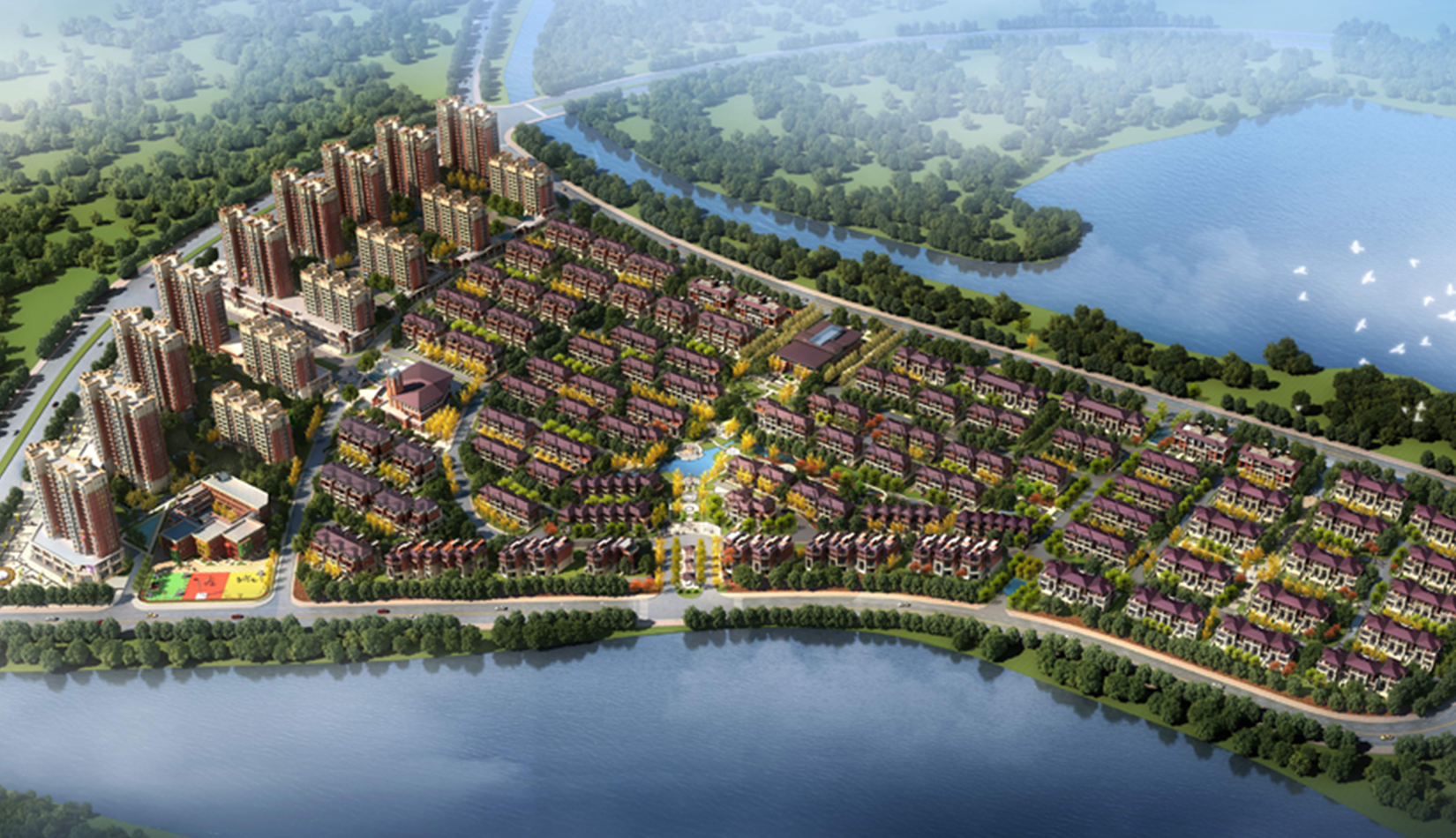 空中俯瞰, “一軸、一帶、三組團”構成了一道靚麗的風景線。軸線自北向南貫穿公園綠地和沿河景觀,景觀帶則自西向東橫穿地塊,構成基本空間骨架的同時,在小區中心交匯成