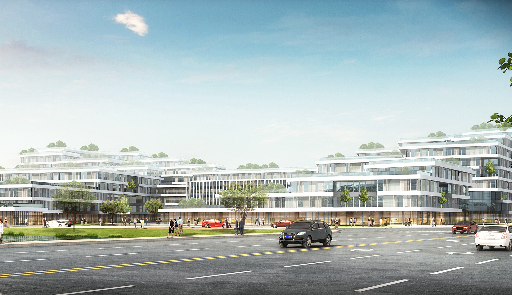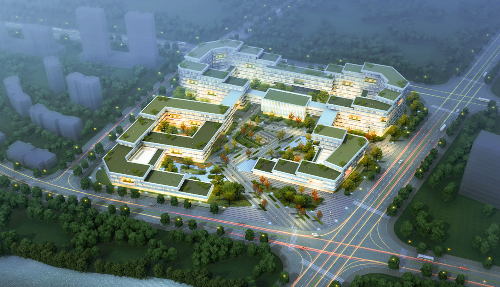 設計大、中、小三種空間尺度的景觀庭院,通過底層架空,使各空間既相互獨立,又互相滲透。增大建筑與景觀的接觸面,打造園林式辦公環境。