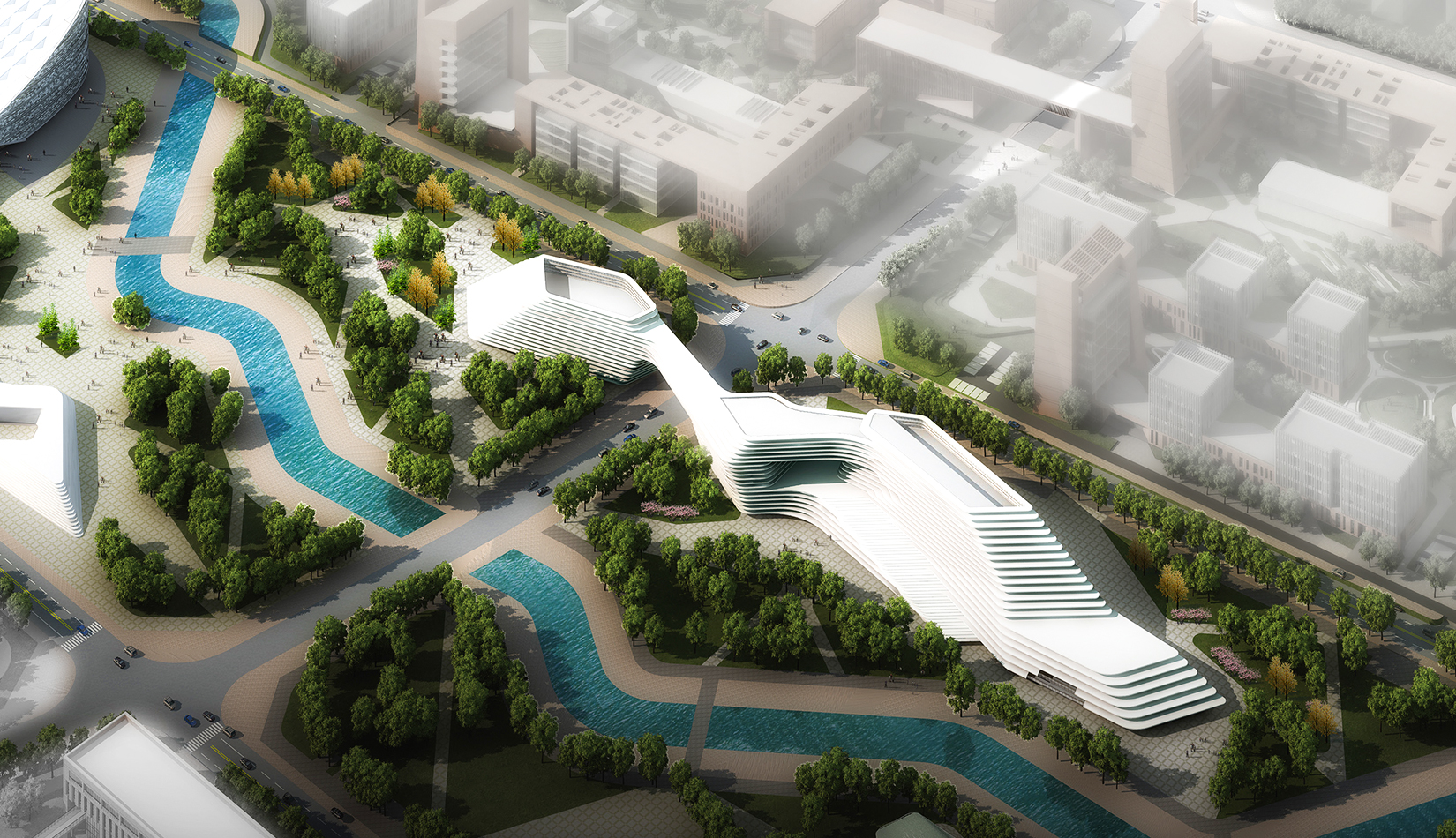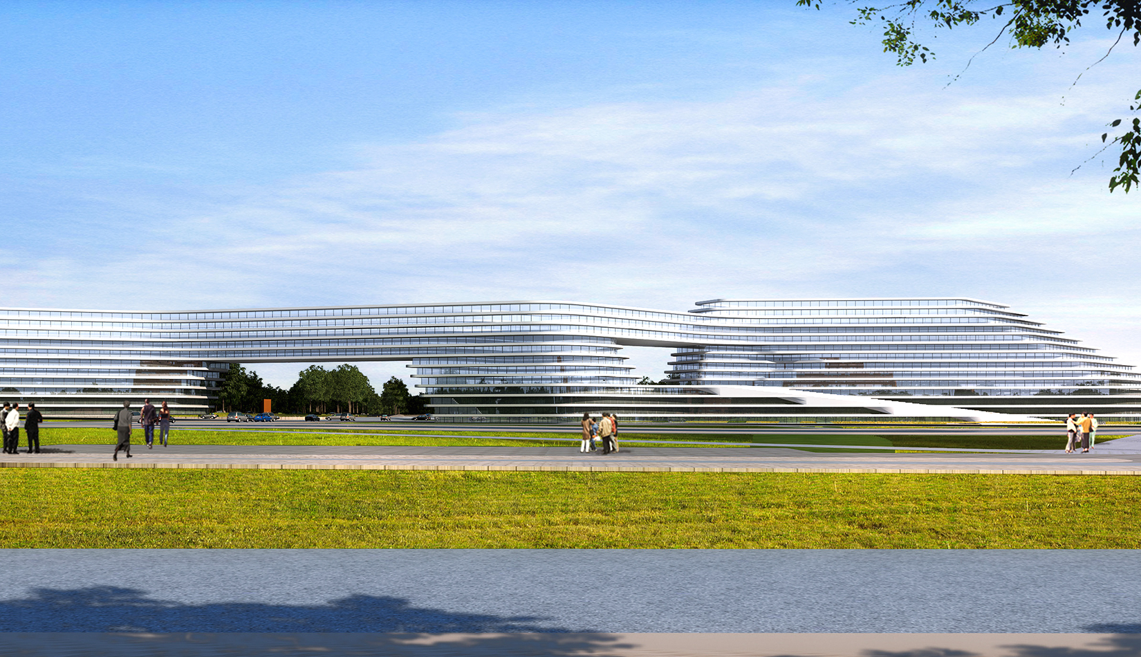 科學講堂位于中心區(qū)景觀主軸的中心腹地,其南的泄洪渠為景觀主軸的景觀帶。設計靈感源于中國天人合一的自然觀和社會觀,所謂仁者樂山智者樂水,通過對山、水肌理的分析與重構,轉換為建筑語言,形成獨具特色的建筑造型。建筑體量形成簡單、沖突的場地氛圍,建筑南向正對園區(qū)中軸線,使得水平向延展的建筑生成了“東高西低”的無邊際界面。由“水面→河岸→場地→建筑”的溪水肌理驅(qū)動建筑臨街面,逐步退后產(chǎn)生特有的河流沖刷意象。水流的蜿蜒曲折使建筑的轉彎處成洞,達到了內(nèi)外視線連續(xù)的綜合效果,并將對建筑的擠壓力平衡到建筑東西兩翼。建筑表皮通過對水的情緒變化等模擬,形成片狀的建筑造型。