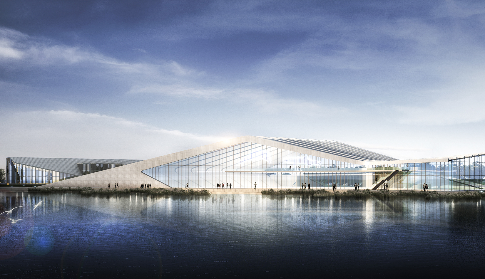 海洋科技館坐落在中科院青島科教園沿海區的中心地帶,沿海岸線呈一字型布局。方案設計以浪花和貝殼為意象,建筑像從場地中生長出來,擁有著與海浪一樣流暢的外形,在與基址和諧相融的同時,也呼應著青島的城市文化和人文關系。大跨度鋼結構結構排架為大空間的開放展示提供了可能,同時營造了無間斷的觀海空間。科技館外墻以玻璃幕墻為主,保證了觀海景觀通透性。