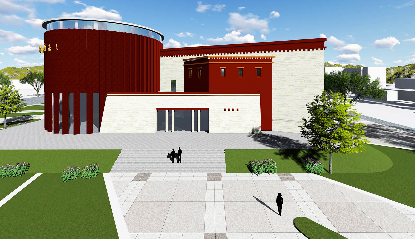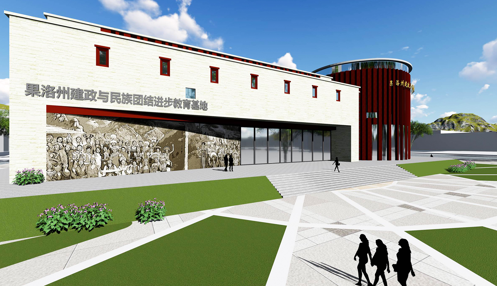 設計造型整體為中心聚攏的形態,圓形體塊是建筑的核心,象征著黨的領導,各分支體塊象征著分布在果洛的各個民族,體現出各民族團結一心,同心向黨,在黨的領導下團結一致、共同奮斗;另一方面,圓形體塊與各分支體塊的簇擁關系也象征著各民族緊密團結,永不分離。