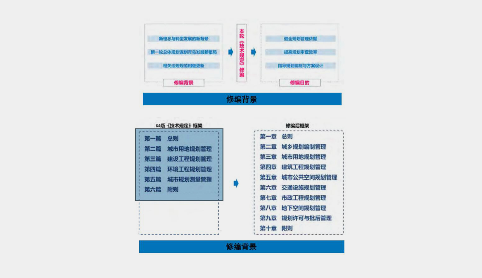 本次修編是在2004 版《青島市城市規劃管理技術規定》(以下簡稱“《技術規定》”)的基礎上,以十八大以來國家一系列城市工作會議文件為指導,結合國務院2016 年1 月批復的《青島市城市總體規劃(2011-2020 年)》總體要求,對接近五年來國家、省、市的各類法律法規、部門規章、技術規范、行業標準加以修改完善。它的試行對健全規劃管理依據、提高規劃審查效率、指導規劃編制與方案設計具有重要意義。