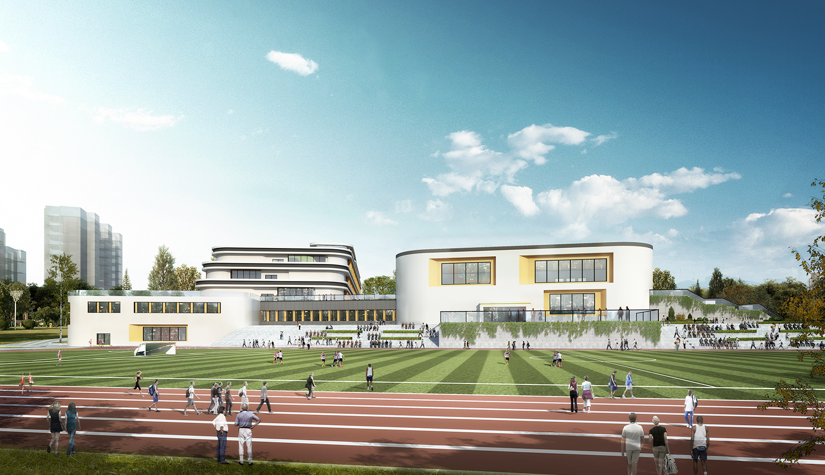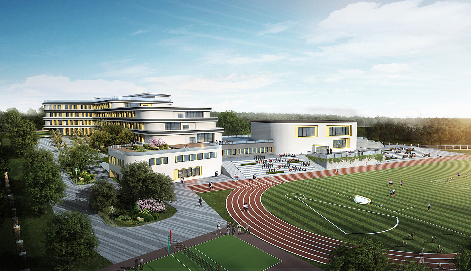 該項目設計打破傳統的班級串聯式學校模式,植入聯系各個功能區的中庭大空間,使用者一旦進入,即可到達任一功能區;同時該中庭大空間又是學生之間、師生之間、及學生家長們的公共自由開放式交流會面空間。