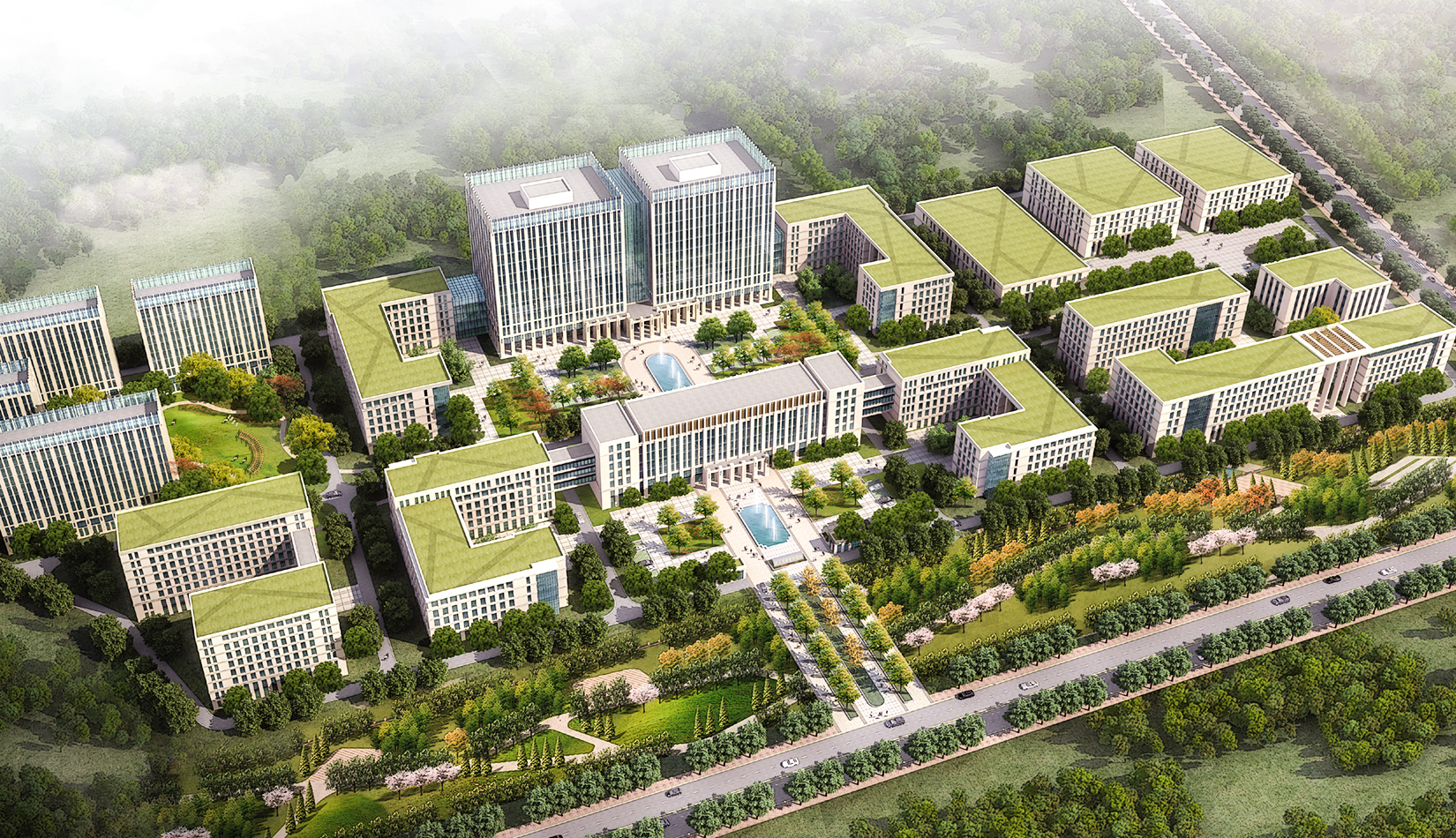 基地位于山東省青島市黃島區顧家崖頭村以東,濱海支路道路紅線以西,大學一路以北區域,占地面積10 萬平米。本著功能至上的布局原則,結合庭院方案按照功能分為五個區域:公寓區、辦公區、廠房區以。辦公區為整個園區的中心,占據基地最重要的中心地帶;公寓區位于基地西側相對比較安靜的地塊;廠房區既要有相對便捷的交通出入口,同時又不能影響整體園區的沿街立面,因此廠房區位于整個基地的東北角,這樣的一個功能分區可以有效的組織人流,使功能更加合理。