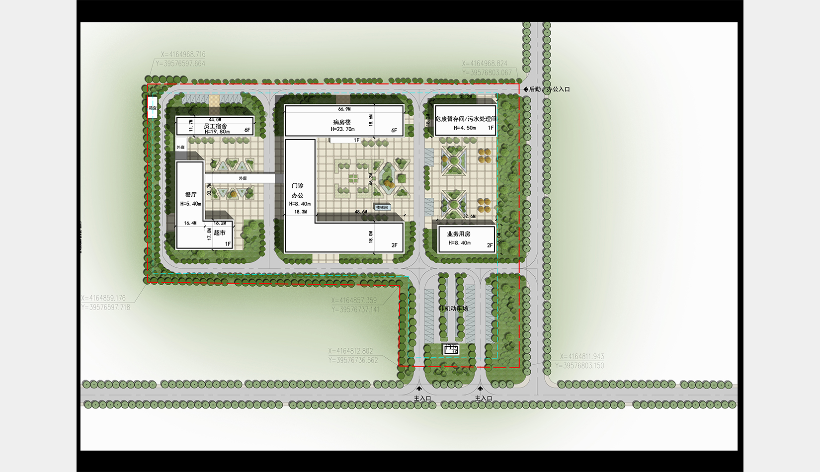 景觀設(shè)計采用圍合、穿插、滲透等設(shè)計手法,營造公園式景觀綠化,與建筑群體融合呼應(yīng),打造一個會呼吸多元化的綠色醫(yī)院,利用建筑之間的圍合關(guān)系,創(chuàng)造動態(tài)的具有生命力的局部景觀。