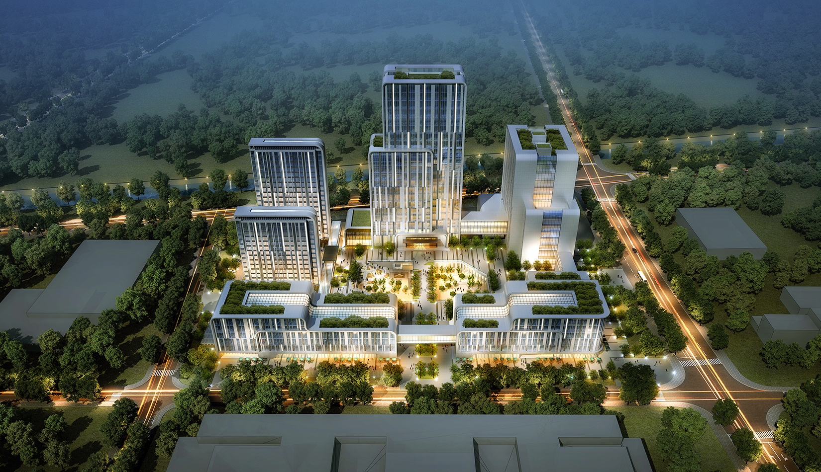 建筑立面風格源自高山流水的形態,通過建筑形態的高低變化,營造“層巒疊嶂”般的高山形態。建筑利用屋面流淌造型,使形體具有動勢,營造“流水”般形態。山泉匯聚成溪,逐級流淌,匯入下沉庭院形成山澗。