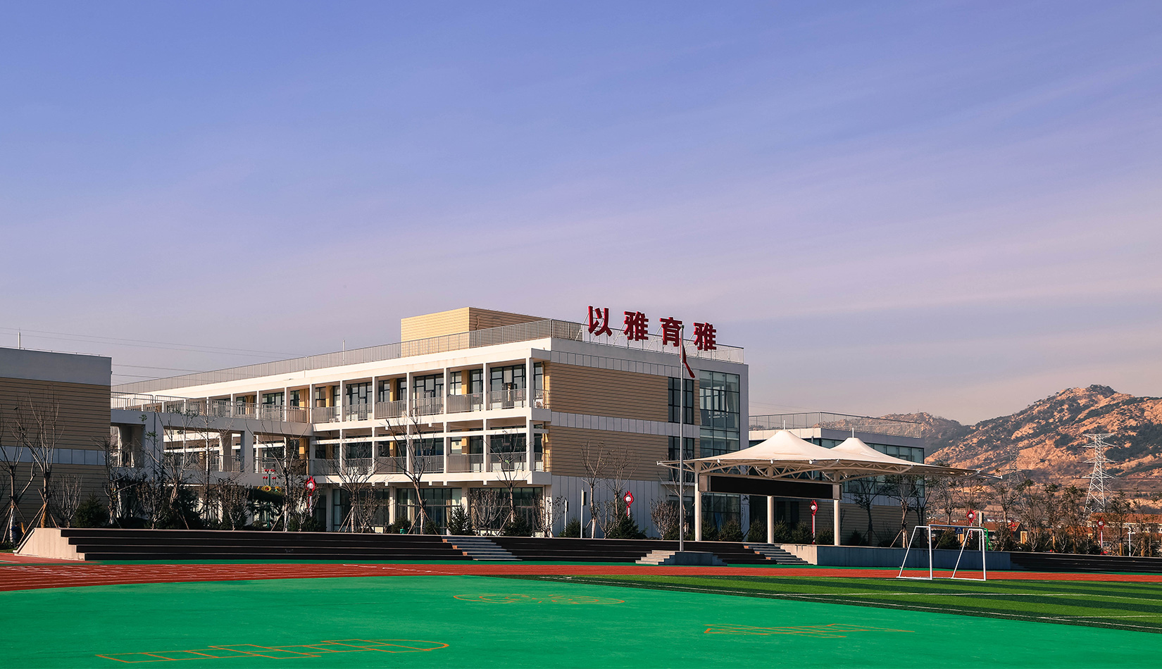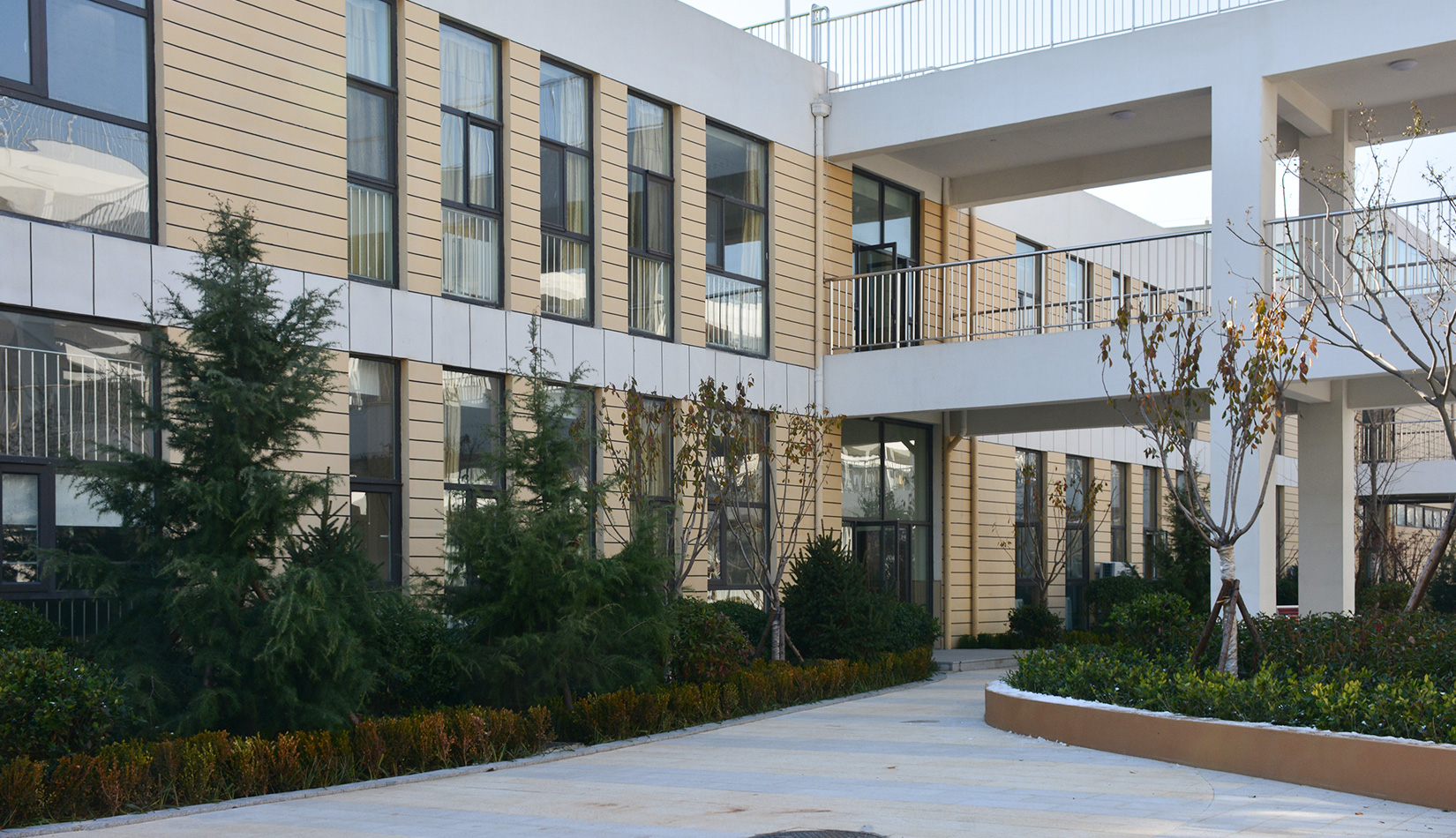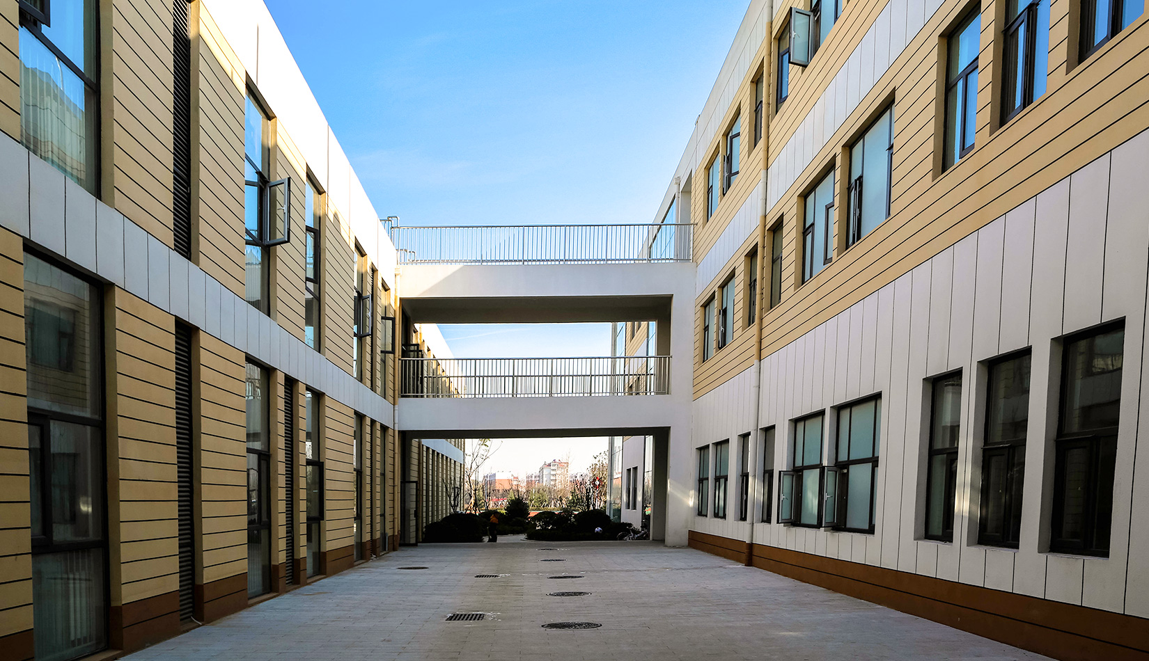 該項目通過幾個建筑單體與架空走廊的穿插連接將整個校區有機聯系起來,實現了建筑功能的整體性,完善了建筑可達性。形成的中庭空間可成為交流為主的平臺,營造了學習、活動為一體的校園氛圍。建筑外立面以簡潔的現代風格為主,同時表現校園文化,主要采用黃色與白色真石漆形成色彩對比,在教室南立面、樓梯間、就餐區等采用整體通透的玻璃幕墻與實墻形成虛實對比,形成簡潔而不失活潑的建筑風格。利用借景等手法進行室外綠化設計,整體打造一個高品質的學校環境。