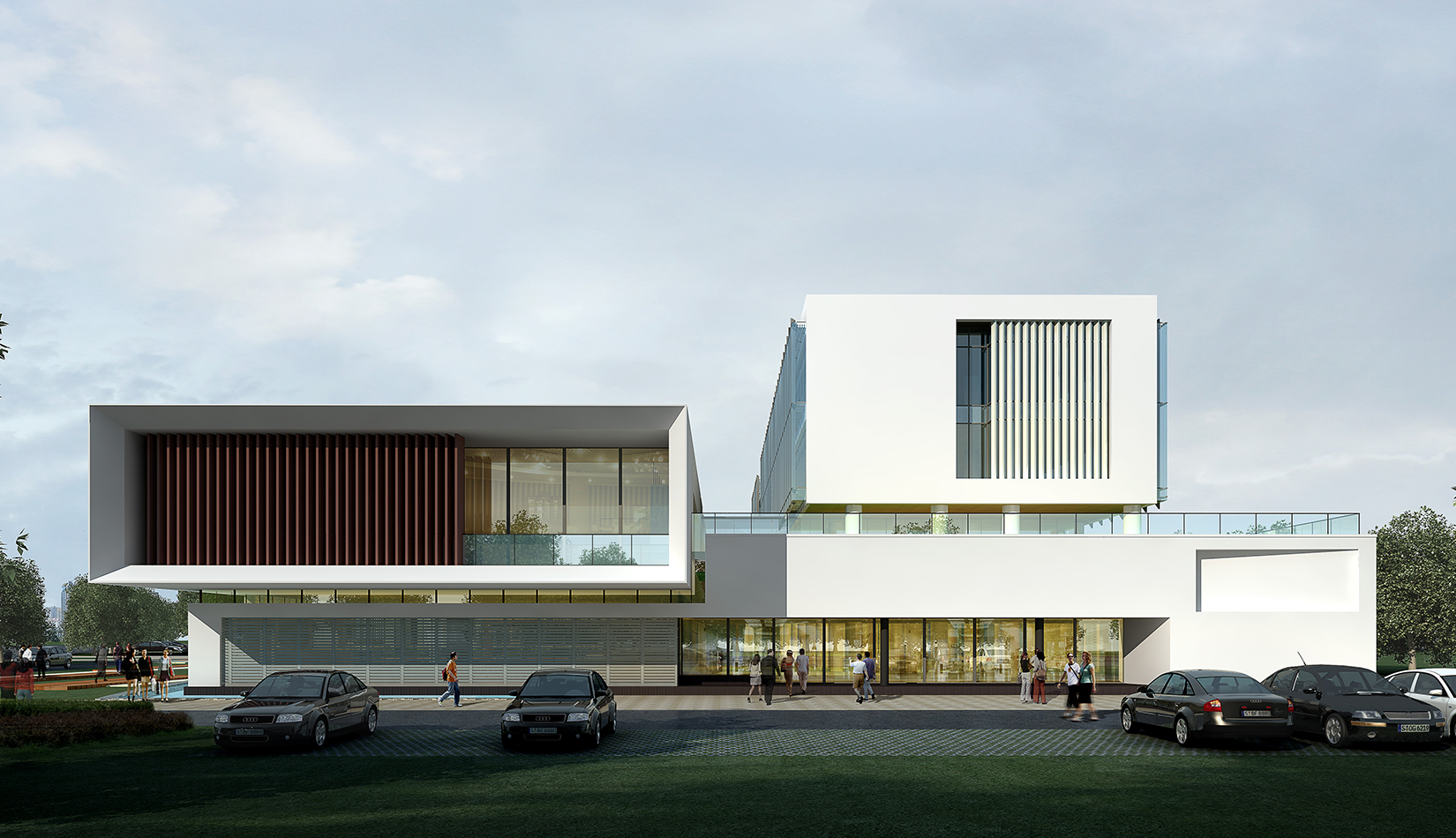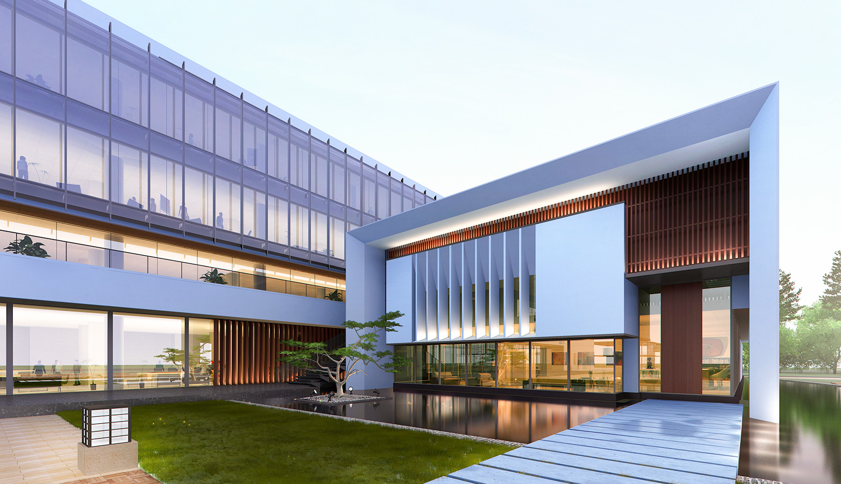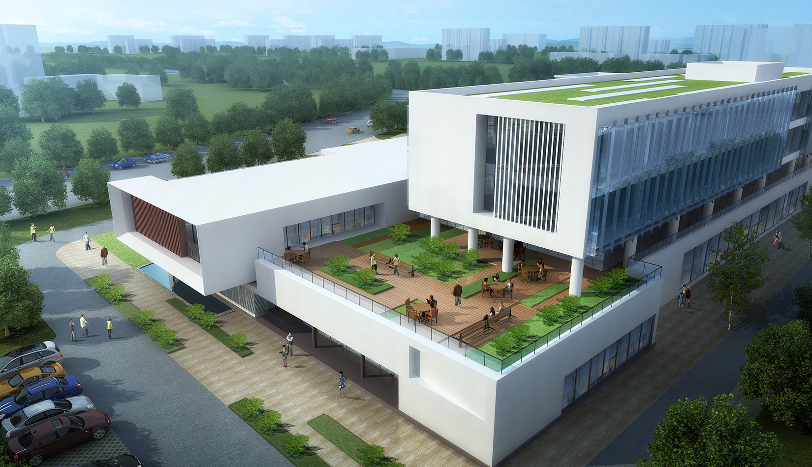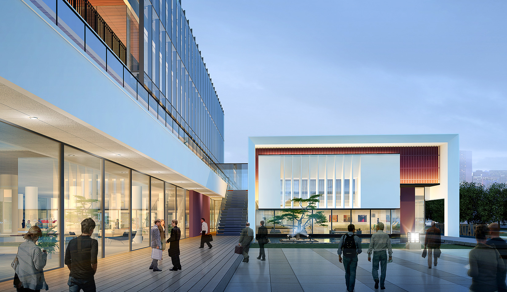 作為中韓貿易合作區一期啟動區的重點項目,其承擔著對外展示以及為后續發展提供服務平臺的功能。因此設計力求穩重大氣,以4 層的體量打造出地標性的建筑。設計運用簡潔的外形、寧靜的色彩,外立面以白色涂料和木格柵為主,尊重自然,打造一種平和寧靜的感覺。在空間設計上通過共享空間、上人露臺和一層大平臺,創造出舒適宜人的工作環境;在技術上通過地源熱泵、呼吸式幕墻、雨水收集等的應用,實現建筑的綠色節能環保。