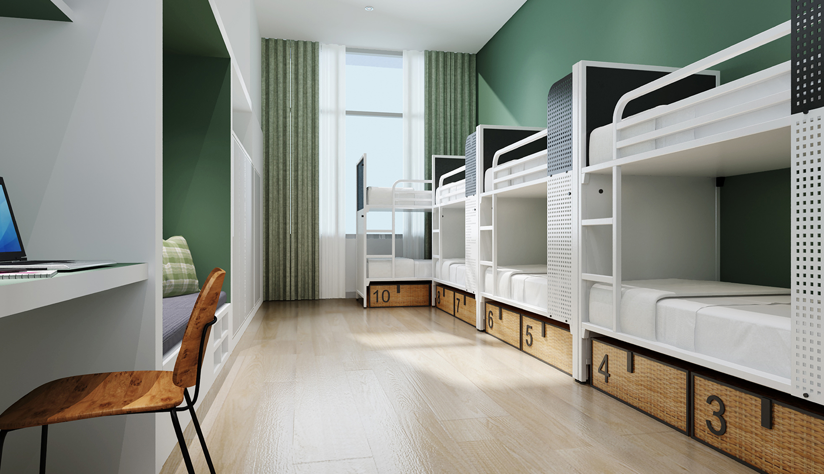 客房采用木色為空間主色調(diào),巧妙利用上下床與衣柜的組合排列方式構(gòu)建出一個(gè)簡潔精致的精品化公寓。