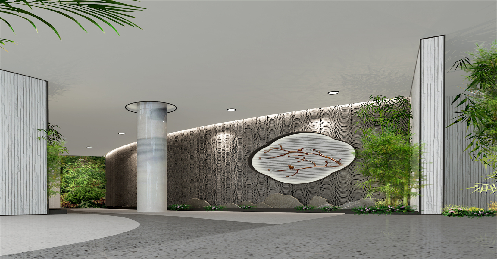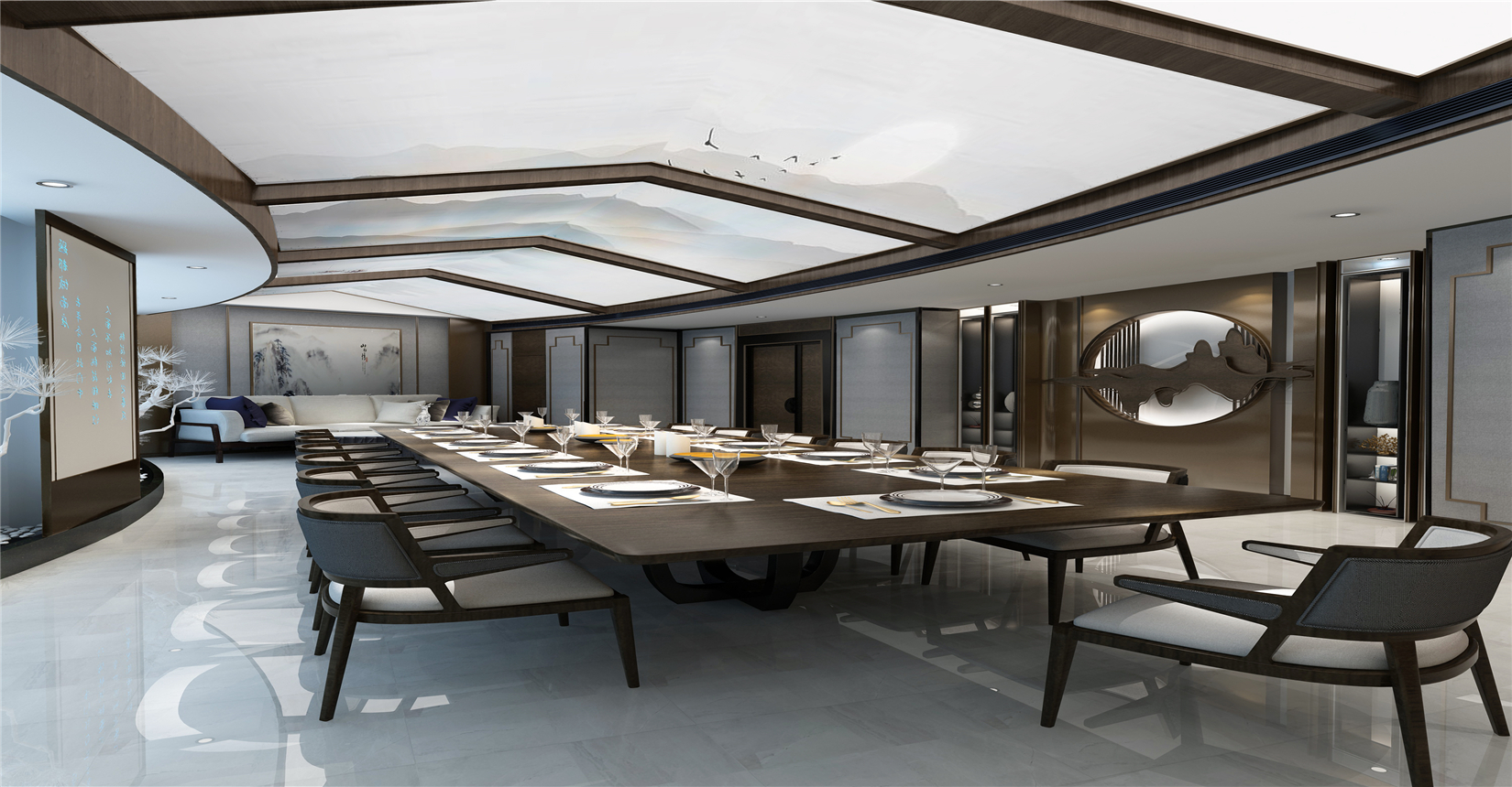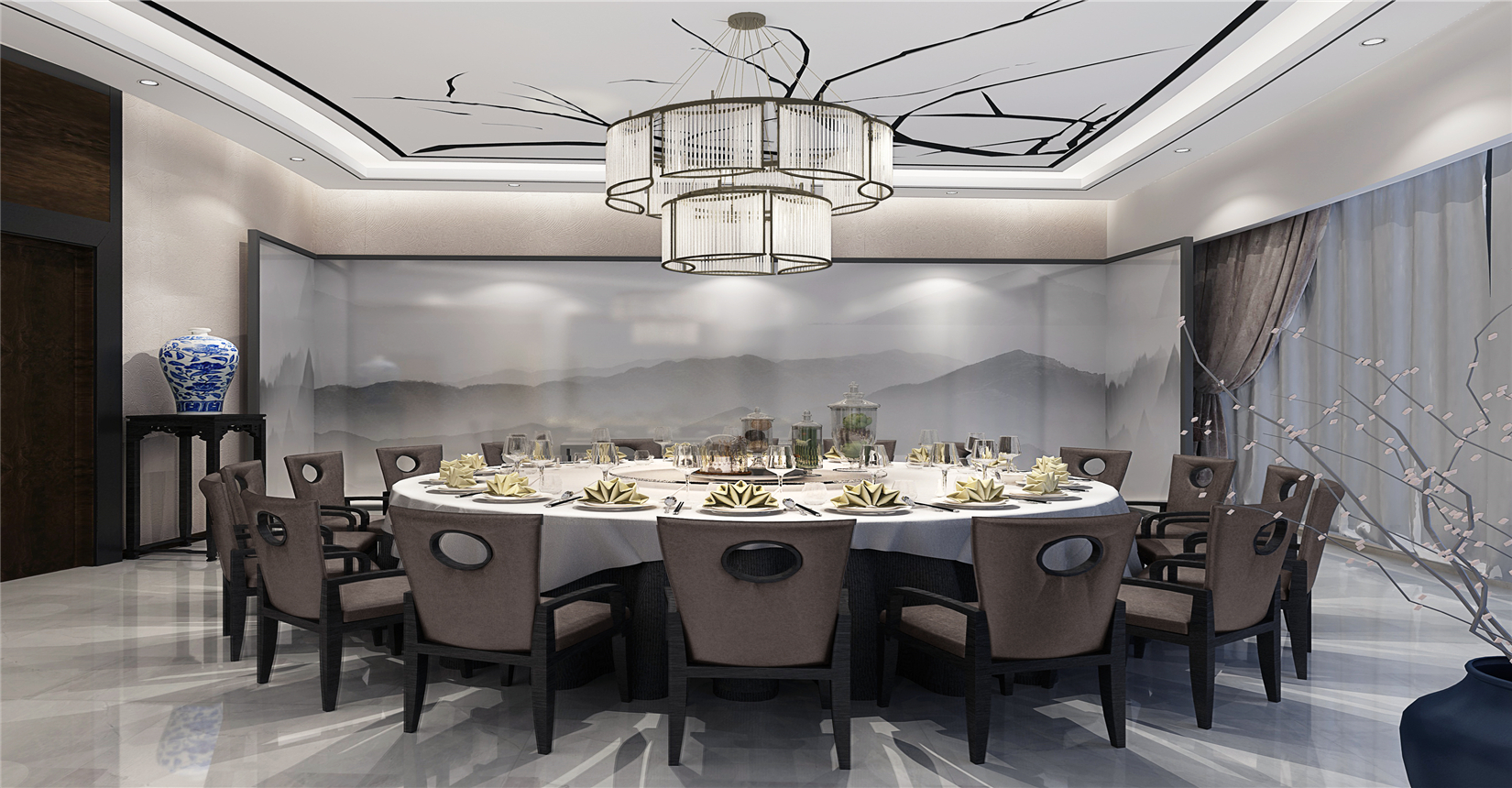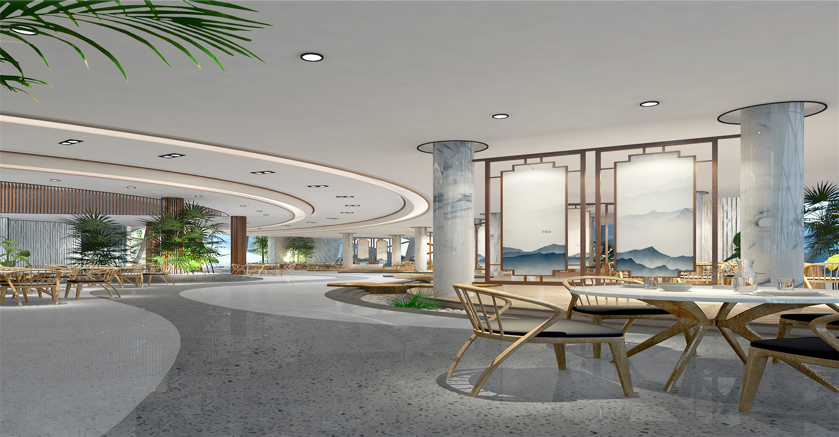 餐廳定位區別于傳統私人生態農莊、農家樂,需要更多結合智慧、科技、現代元素打造生態內核,因此創新性地使用新東方主義設計風格,將東方地域特色的典雅韻味植入于餐廳環境。在材料的使用上,多使用如花崗玉、裝飾纖維水泥板、仿古磚、防腐木地板等自然材料,突出餐廳的整體生態氛圍。
