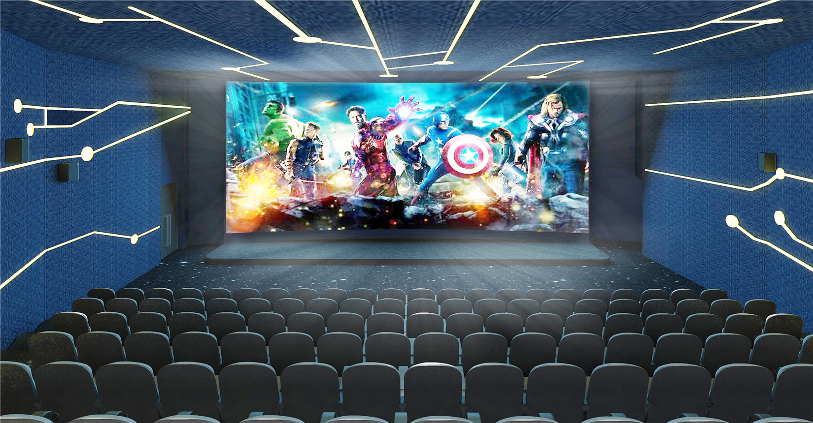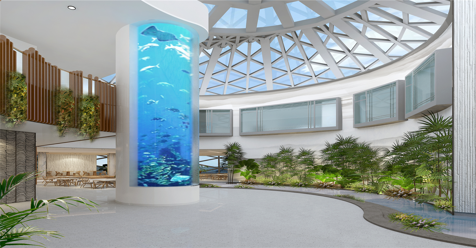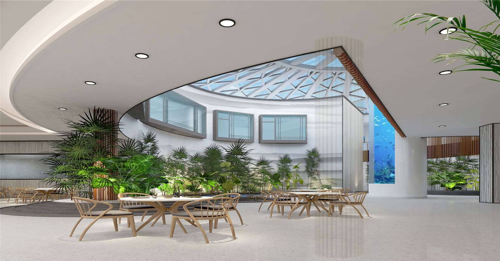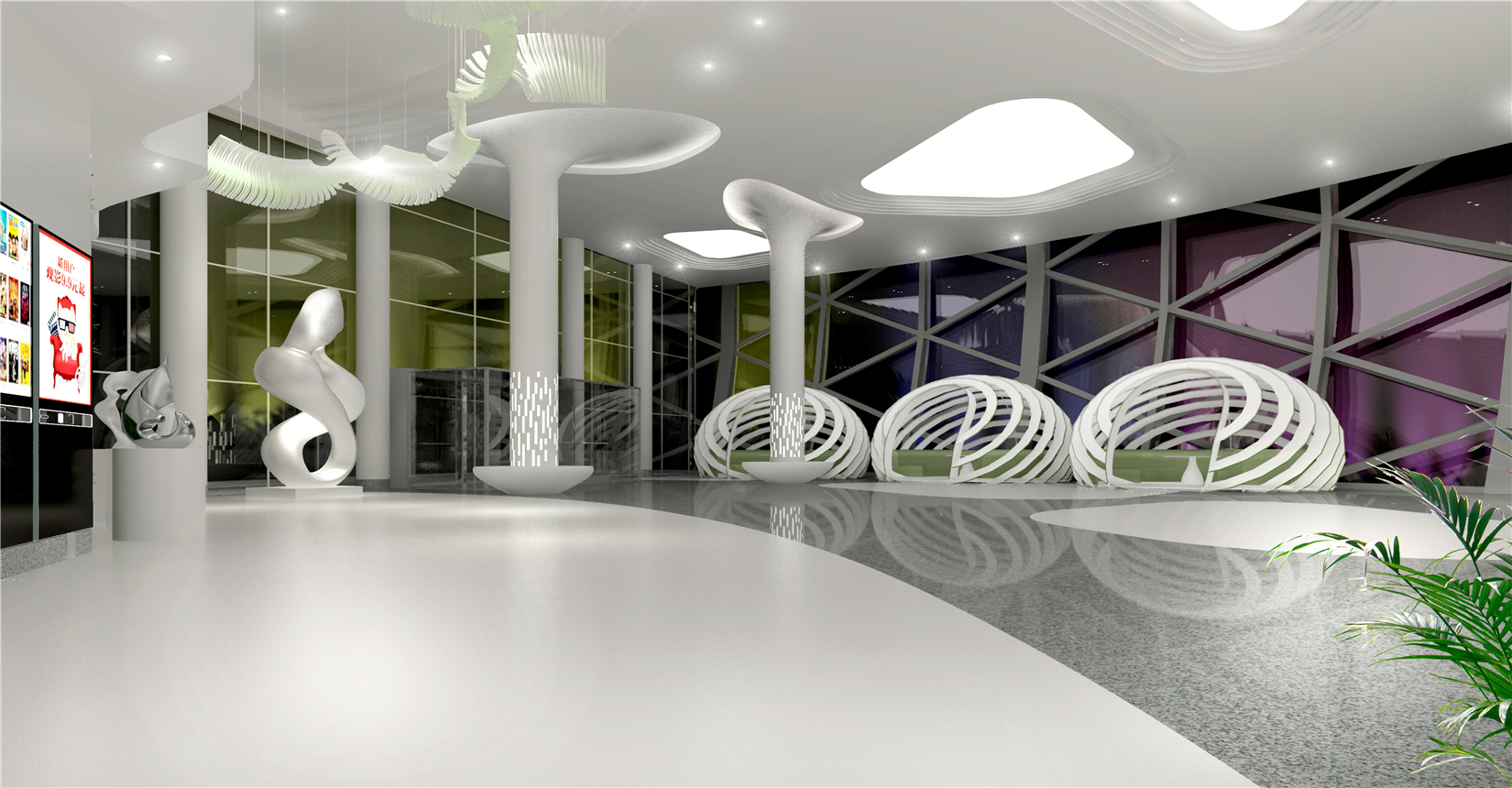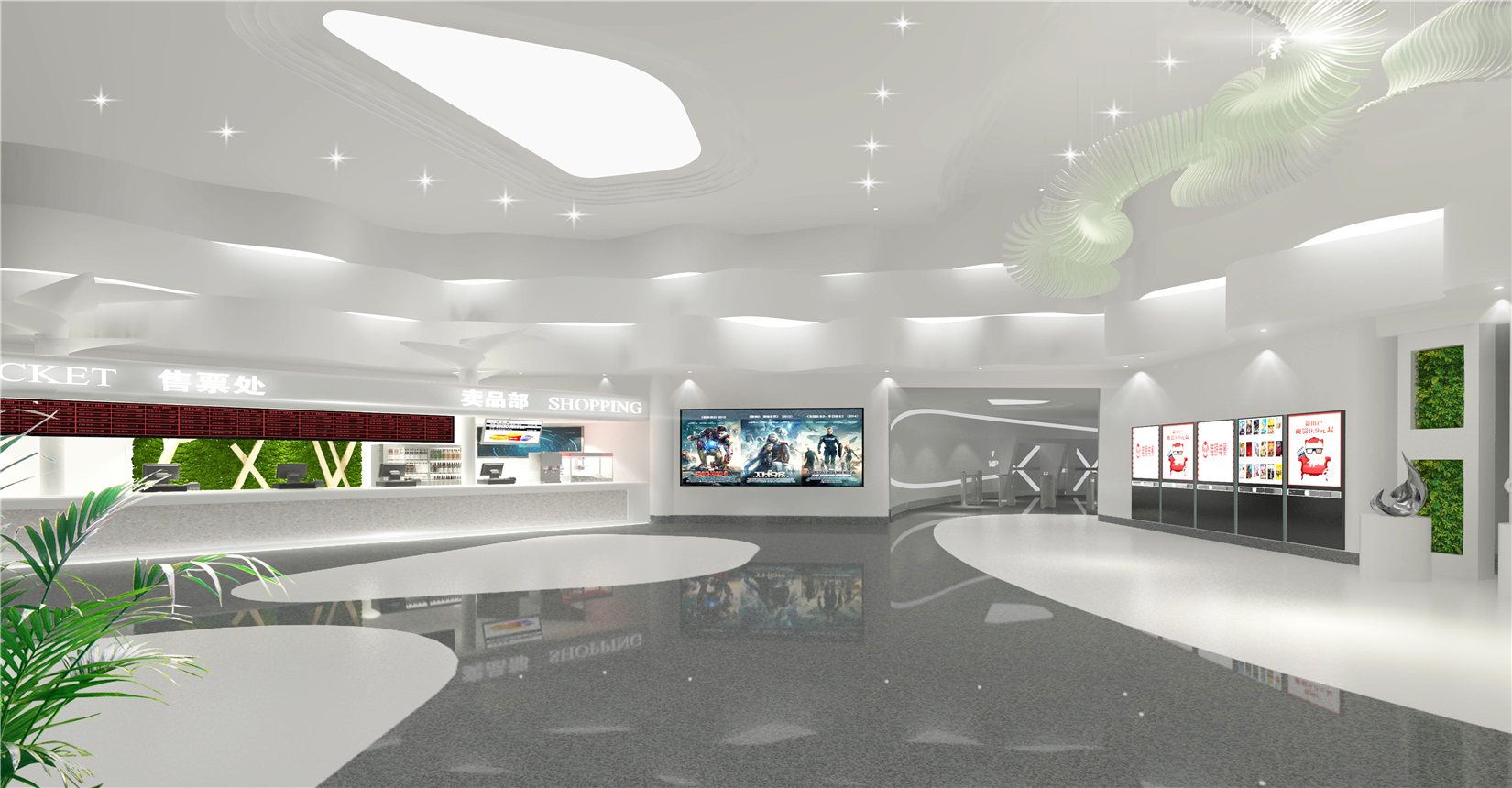 電影院在內部空間造型設計上延續建筑外立面海螺鋼結構美感,以連貫性曲線為特征,做到內外形式美感相呼應。以白色金屬板材、白色系魔石地坪及綠色植物垂直造景墻面為主材,全方面打造契合濕地文化主題的生態景觀體系影城。