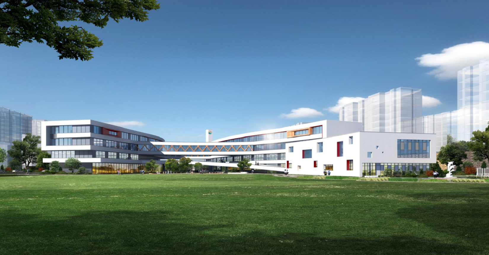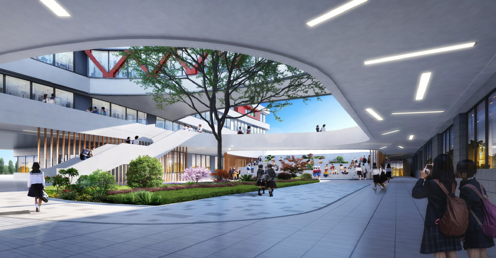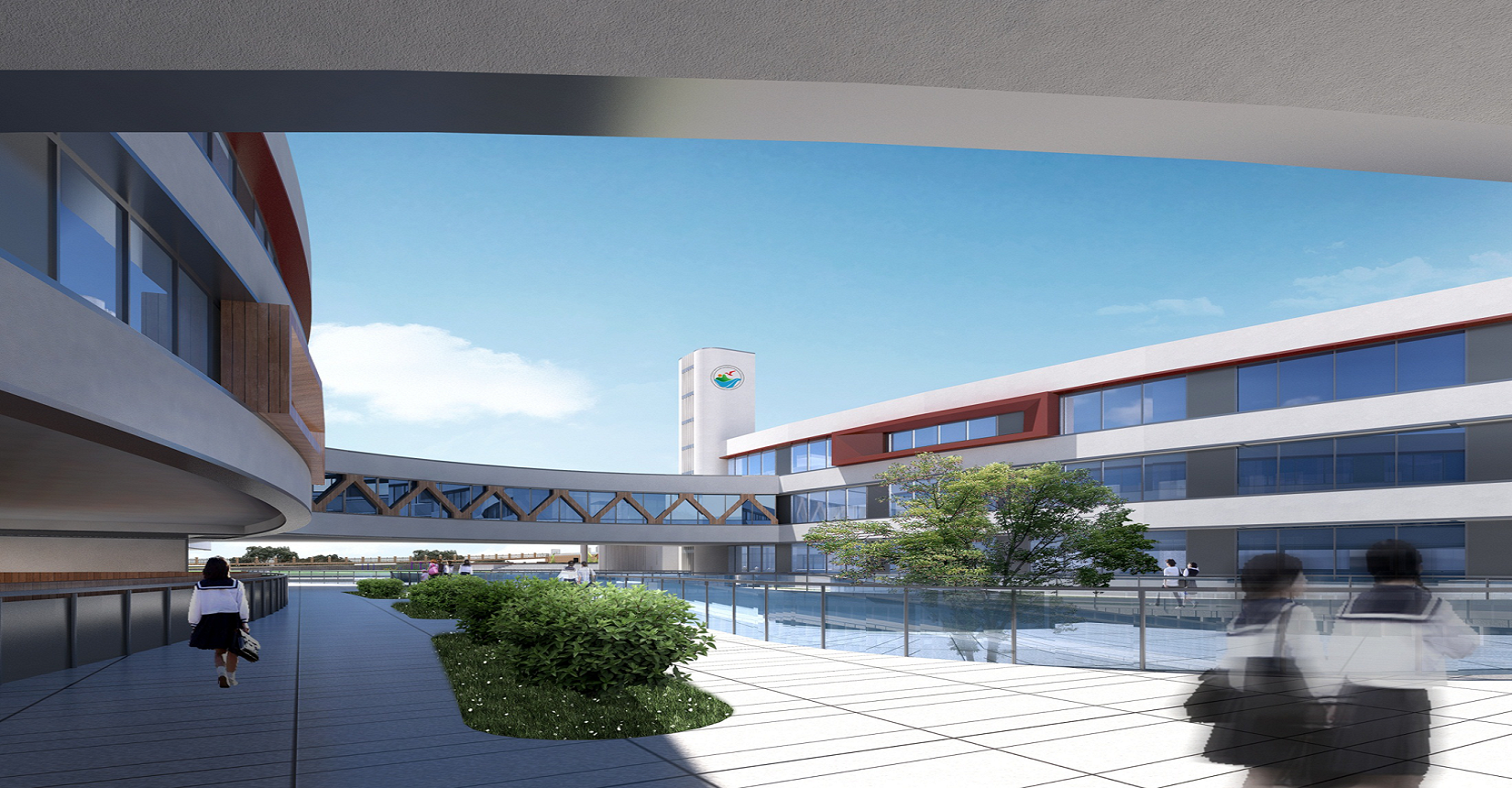 校園規劃采用曲線手法,營造流水姿態,將東側山脈與西側河流連接在一起。設計現代化“山水”校園,使學生在自然中成長。營造活水發源的“源頭”意境,寓意教育為人類文化長河的源頭,呼應學校“源頭”文化。曲線舒展的形體,整體采用白色色調,局部以紅黃色進行點綴,風格純潔又不失活潑。